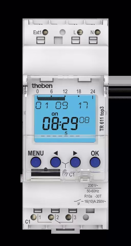 Digital timer for DIN rail, 1 channel, weekly program, external input, 3 special programs, width 2 TE, app programming possible, secure transmission via optional Bluetooth Low Energy OBELISK top3, Maximum tamper resistance, timer programs can only be transferred from the app to the clock when the Bluetooth OBELISK top3 is plugged into the clock, 100% compatible with top2, 600 watts LED power, 800 amps/200 microseconds inrush current, 0.4 watts standby power, DuoFix plug-in terminals, power reserve and programmed summer/winter time changeover, OBELISK interface for PC programming