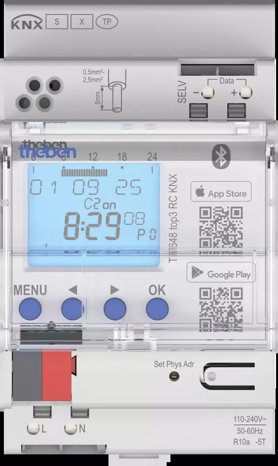 Digital KNX time switch with annual and astro program, app programming possible via integrated BLE module, secure commissioning and communication thanks to KNX Data Secure support, interface for OBELISK top2 memory card (PC programming), programming also possible via KNX bus, Time synchronization via connection of an optional external DCF or GNSS/GPS antenna, with GNSS/GPS additionally position determination for astro program, DuoFix spring-loaded terminals for 2 conductors each, extensive annual clock functions with holiday database and automatic updating, pulse program, cycle program, circuit preselection, continuous ON/OFF switching, sequence timer, integrated operating hours counter, holiday program, 2 random programs, display lighting (can be switched off), PIN coding, automatic summer/winter time changeover, time and date synchronization from other bus participants