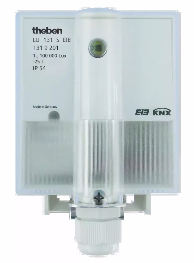 Combination sensor for brightness and temperature, power supply via bus voltage, IP 54 according to DIN EN 60529, 3 brightness thresholds: 1…100,000 lux, 2 temperature thresholds: -25°C to +55°C, 2 shading objects (combination of brightness and temperature), 1 brightness control, 1 brightness value, 1 temperature value, blocking object