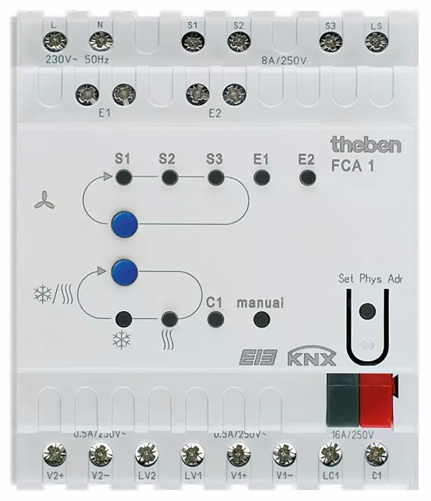 Series installation device, width 4 TE, controls fan coils with up to 3 fan speeds (8 A) and the heating or cooling valve (triacs), 2-pipe and 4-pipe systems are supported, 2-point and 3-point valves can be controlled, an additional relay (16 A) allows control of either an electric heating register or an electric cooling register