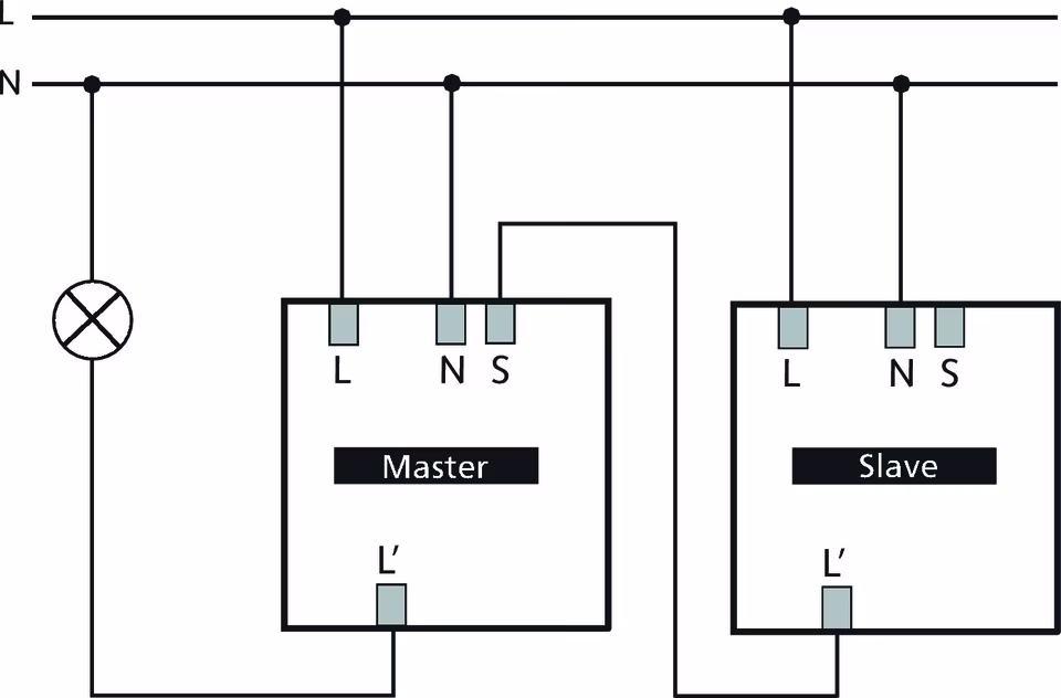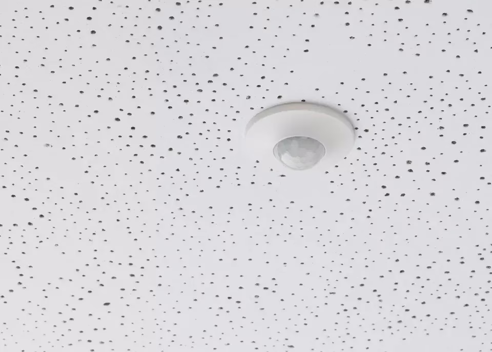 Motion detector for ceiling installation, circular detection area, automatic brightness-dependent control for lighting, mixed light measurement, brightness values and switch-off delay adjustable, parallel connection possible)