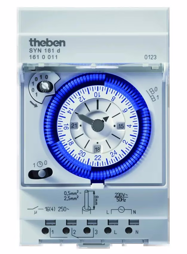 Series-mounted time switch without power reserve, width 52.5 mm, 24-hour program, shortest switching time 15 min., clock hand for time display and 12h/24h recognition, clock time correction possible clockwise and counterclockwise, circuit preselection, manual switch with 3 positions: continuous ON/AUTO/continuous OFF, switching status display, DuoFix spring-loaded terminals for 2 conductors each