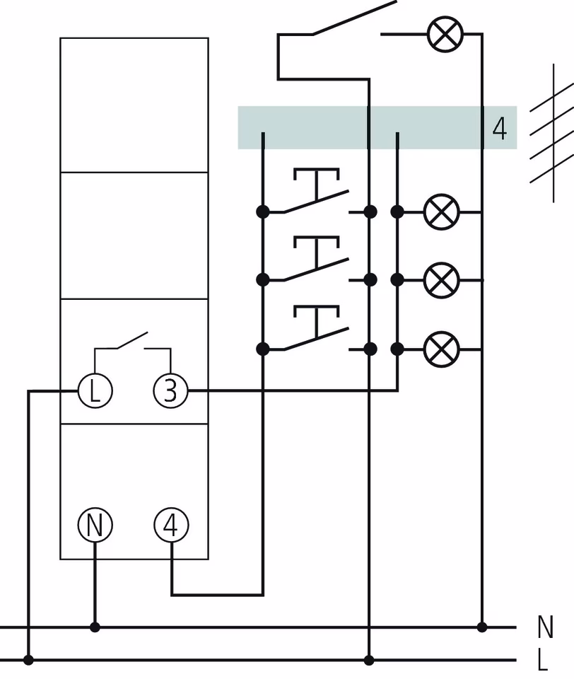 Series-mounted staircase light timer switch (TLZ), width 1 TE, can be connected downstream, pushbutton input, 3- and 4-wire connection, continuous light switch