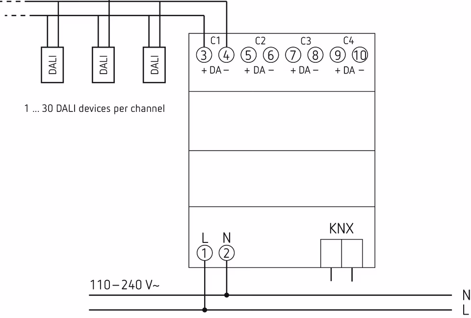 4-way DALI actuator, DALI-2 certified, interface between the DALI system and the KNX bus, 4 channels, broadcast communication, control of up to 30 DALI participants per channel, control of light color and color temperature in accordance with EN 62386-209 (DT-8), easy commissioning and maintenance thanks to broadcast communication, easy replacement of ECGs in case of failure, easy commissioning and programming in the ETS without additional tools or ETS app, secure communication through KNX Data Secure