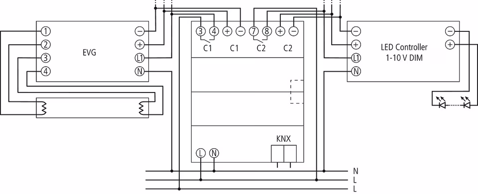 KNX 2-channel control unit enables switching and dimming of lighting circuits in conjunction with electronic ballasts (EVGs), expandable with SME 2 to up to 6 channels or combinable with other devices in the MIX series, series installation housing width 4 TE, 2 relay switching outputs, nominal voltage 230V with zero-crossing switching and one 1-10 V output per channel, features: Diagnosis and feedback object for each channel, manual switch for ON, OFF, BUS even without bus voltage, behavior in case of bus failure and bus or mains return adjustable