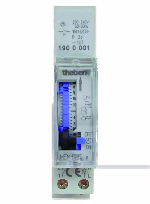 Series-mounted time switch with 3-day power reserve, width 1 TE, 7-day segment program, shortest switching time 2 hours, continuous switch ON/OFF