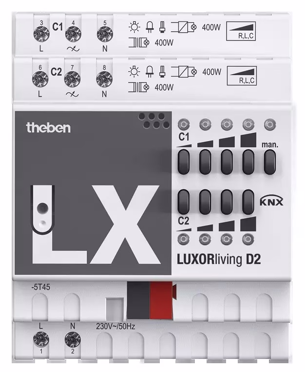 Universal 2-gang dimming actuator for the LUXORliving smart home system, dimming range 0-100%, maximum load: 2x 400 W/VA, for dimming incandescent lamps, low-voltage and high-voltage halogen lamps, dimmable energy-saving lamps, dimmable LED retrofit lamps, different dimming curves enable stepless dimming of all lamp types, automatic load detection (selectable), manual operation 0, 25, 50, 75, and 100% or test